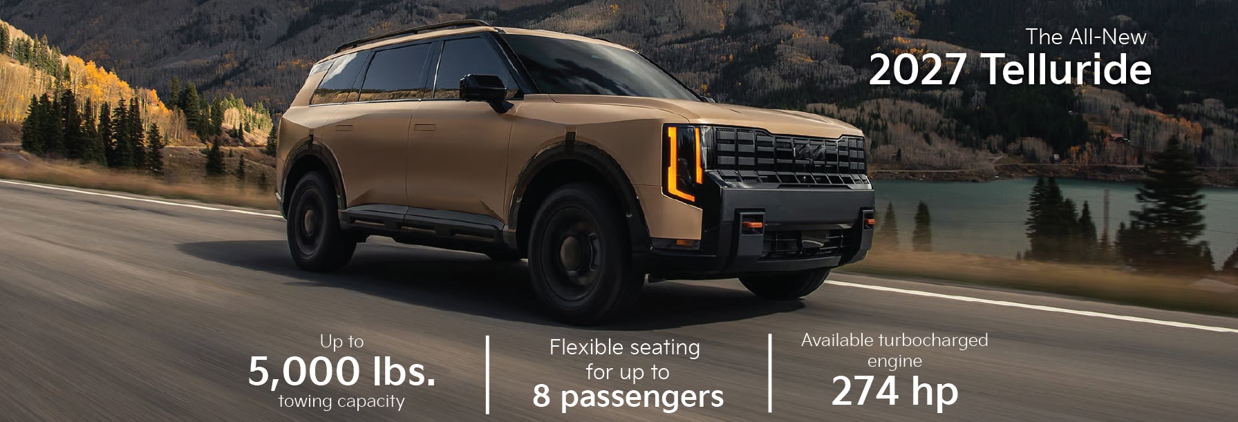 The 2027 Telluride boasts a 2.5-liter turbocharged engine, 274 hp, and 311 lb.-ft. of torque to excel you into adventure with strong acceleration, responsive performance, and extra confidence for highway on-ramp merging and passing.
